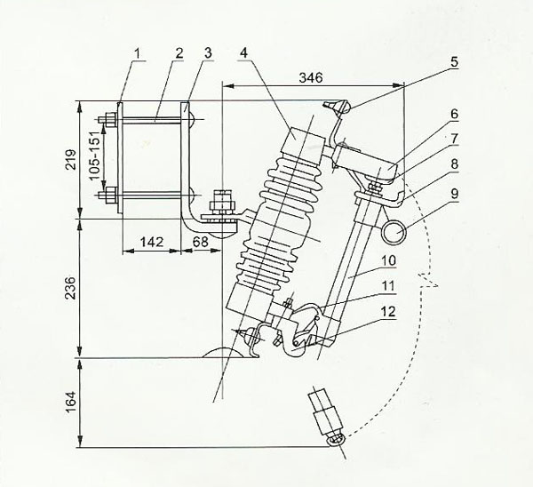 RW4跌落式熔斷器在正常運(yùn)行時(shí),熔絲管借助熔絲張緊后形成閉合位置。當(dāng)系統(tǒng)發(fā)生故障時(shí),故障電流時(shí)熔絲迅速熔斷,并形成電弧,消弧管受電弧灼熱,分解出大量的氣體,使館內(nèi)形成很高壓力,并沿管道形成縱吹,電弧被迅速拉長而熄滅。熔絲熔斷后,下部動(dòng)觸頭失去張力二下翻,鎖緊機(jī)械,釋放熔絲管,熔絲管跌落,形成明顯的開斷位置。當(dāng)需要拉負(fù)荷時(shí),用絕緣桿拉開動(dòng)觸頭,此時(shí)主動(dòng)、靜動(dòng)觸頭仍然接觸,繼續(xù)用絕緣桿拉動(dòng)觸頭,輔助觸頭也分離,在輔助觸頭之間產(chǎn)生電弧,電弧在滅罩狹縫中被拉長,同時(shí)滅弧罩產(chǎn)生氣體,在電流過零時(shí),將電弧熄滅。